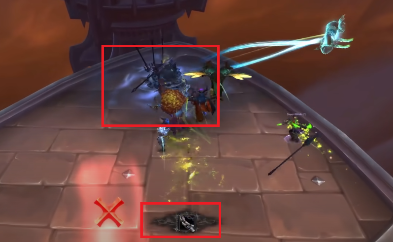 파멸의 시선은 넴드 양옆의 앞쪽에 윗 그림의 위치로 이동하게 되면 아래 붉은색 박스와 같이 엑스트라 버튼이 생깁니다. 이 버튼을 누르면, 반대편 단상으로 이동하여 스킬을 회피할 수 있습니다.