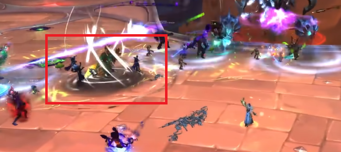황폐의 광선은 위 그림처럼 흰색 넓은 원이 생성됩니다. 이 광선은 혼자 맞으면 아프지 않지만, 주변에 다른 사람이 추가로 있을 경우, 해당 유저는 순식간에 죽을 수 있습니다. 워낙 눈에 띄는 이펙트라 위험하지 않지만 딜러들이 딜 욕심을 내고 최대한 늦게 빠지려다가 엉켜붙어서 죽는 경우가 종종 있습니다. 해당 스킬에 숙달되지 않았다면 걸리자마자 최대한 빠져주는 것이 공대원들을 위한 길입니다.