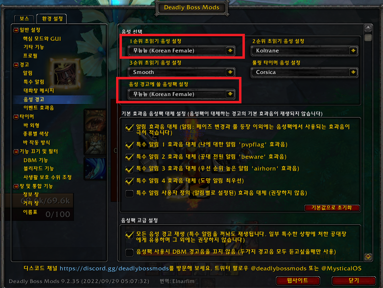 DBM을 하다보면, 경고에 대한 음성들이 많이 존재하는데요. 그 중 한국어로 된 음성팩들을 많이 사용하고 있습니다. 가장 많이 사용하는 음성팩은 무뉴뉴님의 음성팩이고, 그 외에도 딩디링님 등 다양한 음성팩들이 존재하는데요. 음성팩 변경 방법과 음성팩들이 있는 곳의 링크를 달아보도록 하겠습니다. 여기에 직접 올리는 것은 불법이기 때문에 링크로 대체합니다.