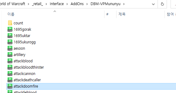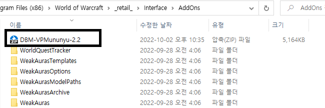 무뉴뉴 음성팩을 다운로드 하면, "DBM-VPMununyu.zip" 형태의 파일을 다운로드 받게 되는데요. 이 파일을 와우가 설치된 폴더/_retail_/interface/AddOns 로 파일을 옮깁니다.