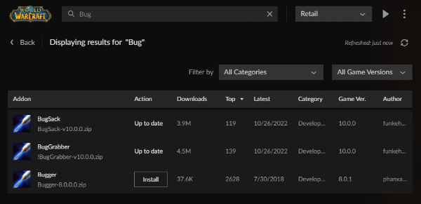BugSack과 BugGrabber는 한몸의 애드온으로 둘다 설치를 해야 합니다. 아무래도 하나는 UI적인 측면(BugSack)이고 다른 하나는 에드온을 체크(BugGrabber)하는 용도로 나뉜 것으로 판단하고 있습니다.
