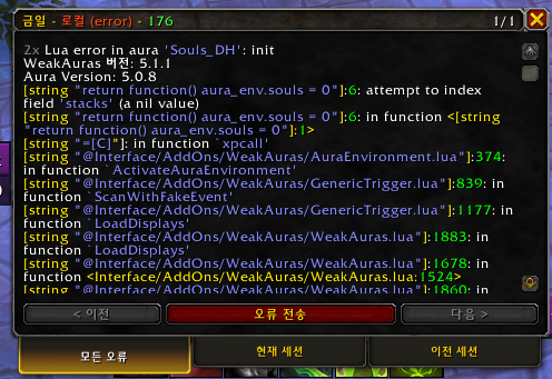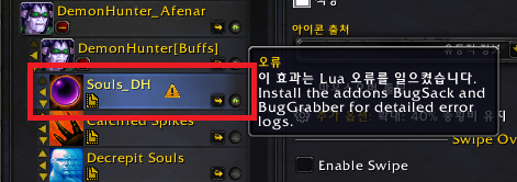 현재 에러가 발생한 상태라면 이 아이콘을 클릭시 아래와 같이 에러가 발생했다는 메세지를 볼 수 있습니다. 아래의 메세지는 현재 사용하고 있는 악마사냥꾼의 위크오라에서 Souls_DH라는 Aura가 에러가 났다는 것을 볼 수 있는 것이죠.