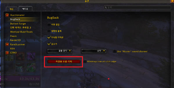 에러가 날만한 곳을 수정하거나 삭제 하였다면, 이제 에러가 발생한 메세지를 지워야 합니다. 에러의 경우 수정하더라도 계속 남아있기 때문이며, 다른 에러가 사이드 이펙으로 발생했는지 체크도 해봐야 하기 때문에 꼭 지워주시기 바랍니다. 지우는 방법은 지도에 있는 BugSack 아이콘을 우클릭하게 되면, 아래와 같이 애드온 설정이 뜨는데요. "저장된 오류 삭제" 버튼을 클릭하시면 메세지가 클리어 됩니다.