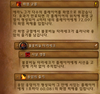 화염 균열은 에라노그가 랜덤한 유저들에게 4미터 반경의 원 형태의 디버프를 걸게 하고, 디버프의 시간이 만료되면 4미터 플레이어에게 화염 피해(일반 3만대, 영웅 7만대의 피해)를 입힌 후 바닥을 생성하고, 거기서 쫄까지 나오는 종합 선물 세트의 공격을 보여줍니다.