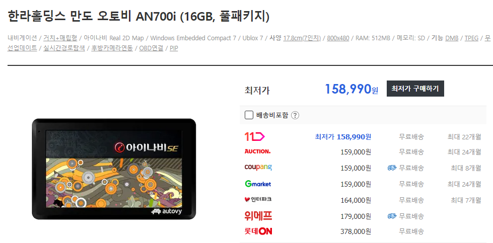 오토비(Autovy)라는 브랜드는 유명 네비게이션 업체인 한라홀딩스 만도에서 온라인 전용으로 제작하는 네비게이션 브랜드이고, AN700i 제품은 현재 약 15만원에 거래되는 제품이기도 합니다.