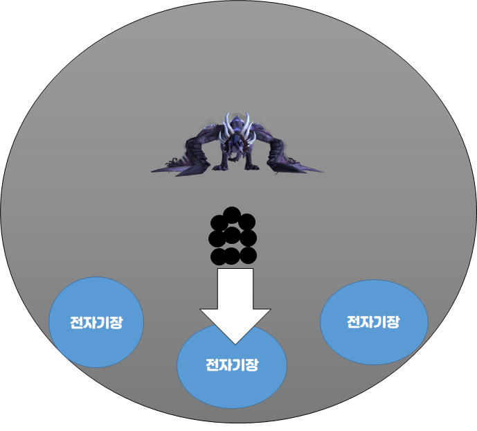 마치 4넴드인 차가운 숨결의 세나스의 경우 위험할 경우 거미줄 바닥을 밟아서 사는 것과 유사한 느낌이라 볼 수 있습니다. 이를 위해서 전자기장은 공격대에 맞게 깔아야 하며, 공격대원들은 너무 정신없이 산개하는 것보다는 전자기장을 맞춰서 산개를 하는 것이 좋습니다. 이를 진형으로 보자면 아래와 같이 볼 수 있겠네요.
