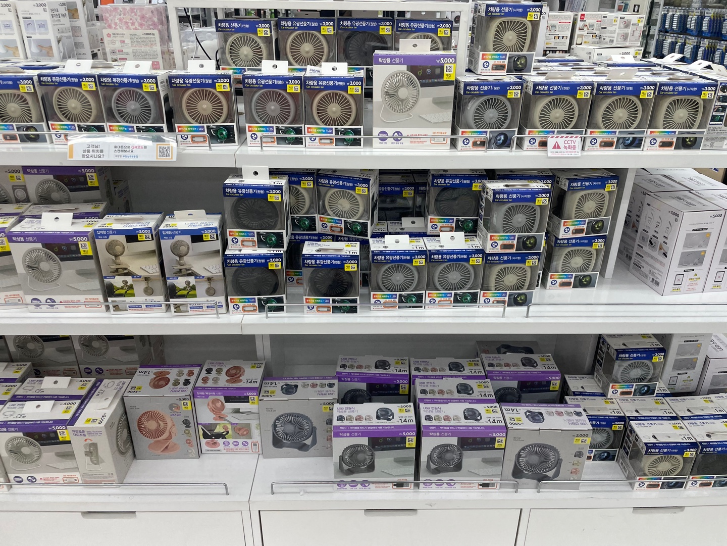 게다가 내가 원한건 검정색 사각형 모양의 선풍기를 원했는데 원형 베이직 색 컬러만 한개 보여서, 아 여기는 이거 하나 남았구나 생각에 원형 베이직 선풍기를 구매하려던 찰나, 다른 이유 때문에 전자기기 코너로 갔는데 거기에 내가 찾는 선풍기들이 몇백개가 있는 것이 아니던가? 그야말로 다이소 핵심 제품인듯 보였다.