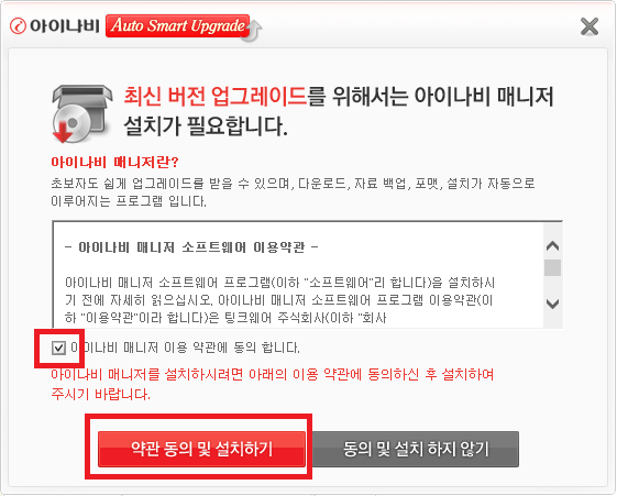 "아이나비 매니저 이용 약관에 동의 합니다." 왼쪽에 있는 체크박스를 클릭하여 약관에 동의하고, "약관 동의 및 설치하기" 버튼을 클릭하여 설치를 진행합니다.