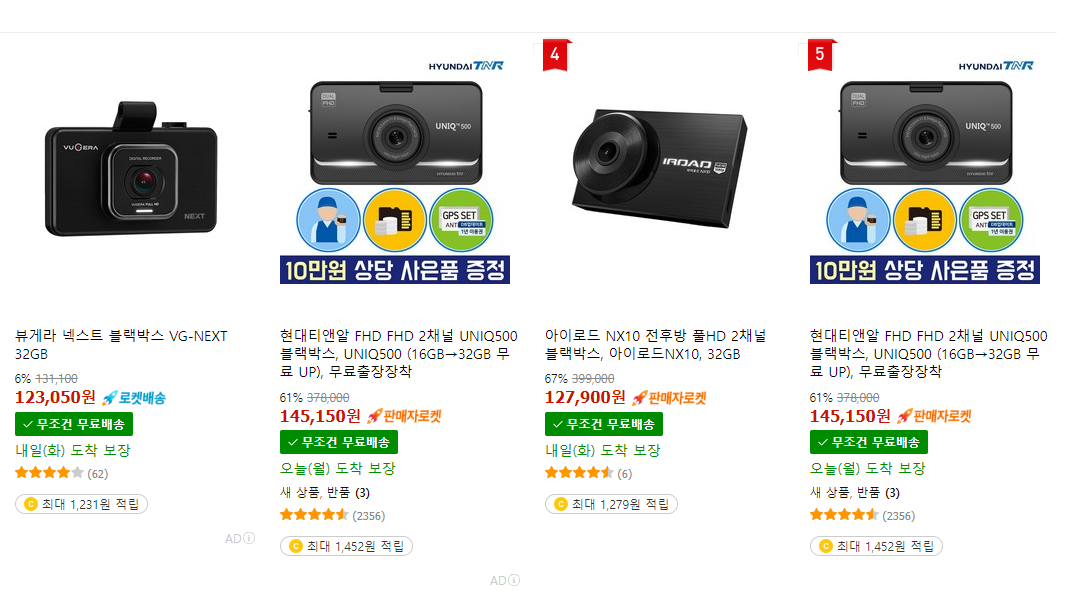 이처럼 가격이 비슷하면, 2~3만원 정도 더 내고 좋은 블랙박스를 사용하는 것이 좋을텐데요. 그 이유는 다음 블랙박스를 설치할 때 동일한 블랙박스가 이미 설치 되어 있으면, 기기만 사서 교체를 해도 됩니다. 예를 들어 전원이 동일할 경우, 이 작업을 하지 않고 기기만 교체하게 되면 출장 제품이 아니라 자가설치용 제품으로 좀 더 저렴하게 사서 교체를 할 수 있습니다.