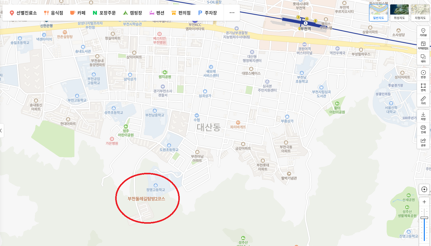 내가 사는 집이 부천역에서 멀지 않기 때문에 집에서 도보로 동그라미가 칠해진 지역으로 이동을 한 후 시작을 했는데 저기까지 가는 길도 등산 코스라 생각할 정도로 고도가 높다.