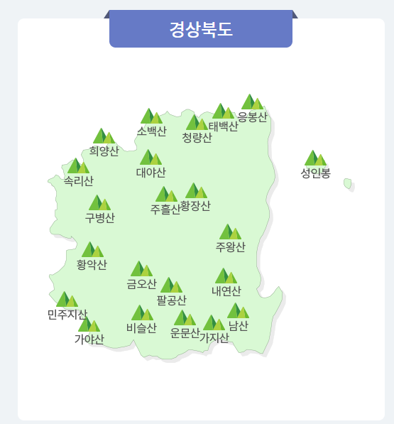 구병산, 금오산, 남산(금오산), 내연산, 대야산, 비슬산, 성인봉, 소백산, 속리산, 운문산, 주왕산, 주흘산, 청량산, 팔공산, 황악산, 황장산, 희양산