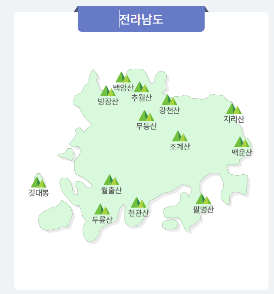 깃대봉, 두륜산, 무등산, 방장산, 백운산(광양), 월출산, 조계산, 천관산, 추월산, 팔영산