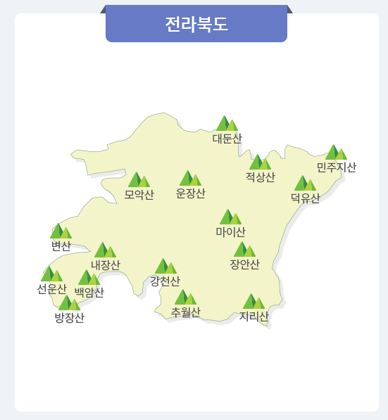 강천산, 내장산, 덕유산, 마이산, 모악산, 백암산, 변산, 선운산, 운장산, 장안산, 적상산, 지리산