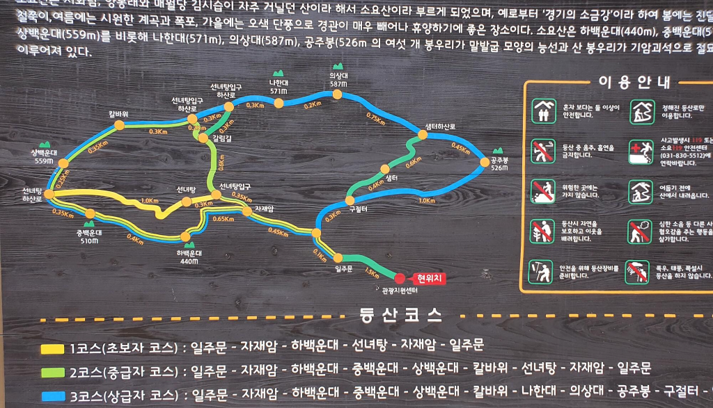 소요산은 블랙야크 뿐만 아니라 산림청에서 선정하는 100대 명산에도 선정되었다. 위 내용은 산림청에서 선정한 이유인데 접근성이 높고, 역사적인 의미가 있기 때문에 선정한 것 같다. 물론 그것도 있고 북한산 주변 산들이 사실 꽤 수준이 높은 산들이 많기 때문에 당연히 선정되었다 생각한다.