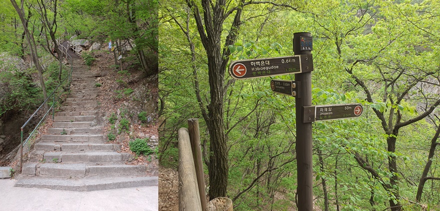 본격적인 산행이 시작되면서 계단들이 나오고 자재암을 가기 위한 길들이 나타난다.